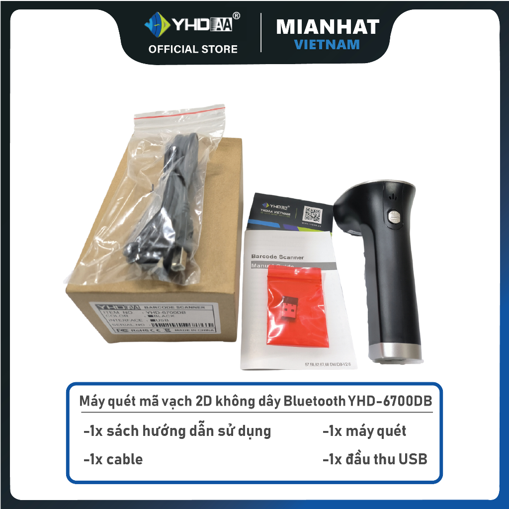 Máy quét mã vạch không dây 2D QRCODE YHD - 5700DWR quét cả mã 1D và 2D, kết nối qua đầu thu USB với laptop, máy tính
