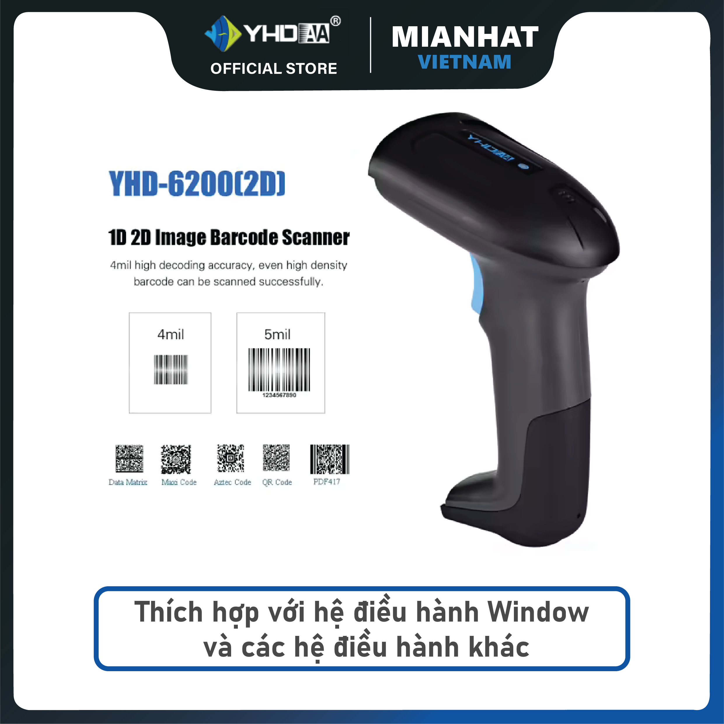 – Máy quét mã vạch có dây YHDAA 6200D 2D đọc tất cả các loại mã vạch 1D 2D dùng dây cắm cổng USB máy tính bàn, Laptop, PC, …. và các thiết bị có cổng USB khác.